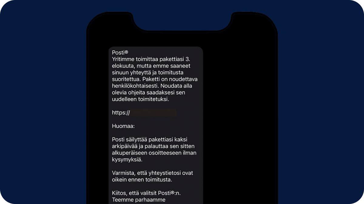 Viestissä yritetään vedota kiireelliseen toimenpiteeseen ja saada vastaanottaja siirtymään viestissä olevan linkin kautta huijaussivustolle.